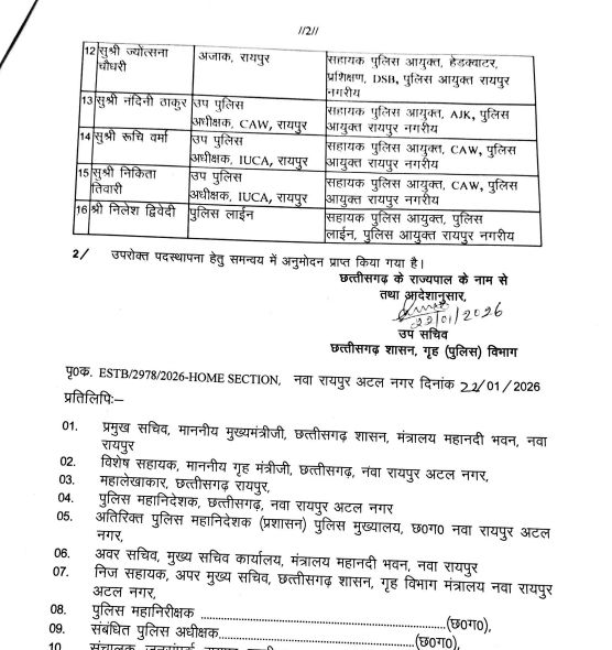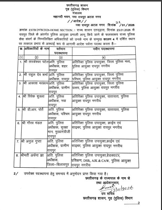 रायपुर। छत्तीसगढ़ शासन ने राजधानी रायपुर में पुलिस कमिश्नरी प्रणाली लागू करने की तैयारी के तहत पुलिस विभाग में बड़ा प्रशासनिक फेरबदल किया है। गृह (पुलिस) विभाग द्वारा ने राज्य पुलिस सेवा संवर्ग 24 अधिकारियों की नई पदस्थापना आदेश जारी की है।