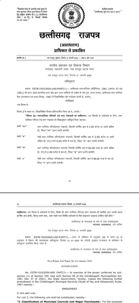 रायपुर। छत्तीसगढ़ में लगभग 45 साल बाद नगर पालिक परिषदों एवं नगर पंचायतों का आय-आधारित वर्गीकरण किया गया है। छत्तीसगढ़ शासन ने इस संबंध में छत्तीसगढ़ नगरपालिका सेवा (वेतनमान एवं भत्ते) नियम, 1967 में संशोधन करते हुए नियम–3 को प्रतिस्थापित कर दिया है। नगरीय प्रशासन एवं विकास विभाग द्वारा जारी अधिसूचना के अनुसार नगरीय निकायों का वर्गीकरण अब उनकी वार्षिक आय के आधार पर निर्धारित किया गया है।