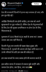 भूपेश बघेल ने कहा है कि पुलवामा में 300 किलो RDX कहां से आया था? इसका जवाब अब तक नहीं मिला है। दिल्ली में हुए बम धमाके की खबर बेहद दुखद और चिंताजनक है। मृतकों की आत्मा को ईश्वर शांति प्रदान करें। उनके परिवारों के प्रति हम सब की संवेदना है। हम सब घायलों के जल्द स्वस्थ होने की कामना करते हैं। इस कठिन समय में सरकार से सवाल पूछे जाएंगे और जवाब देना होगा।