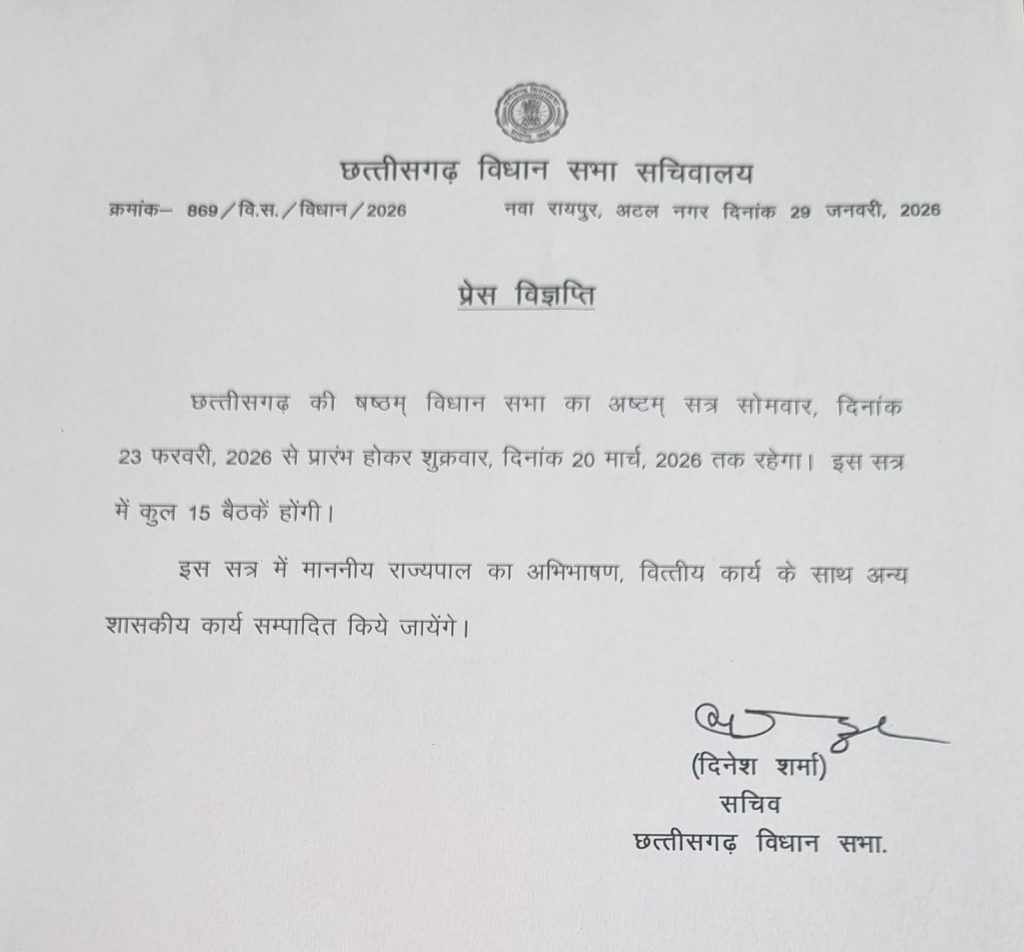 छत्तीसगढ़ विधानसभा सत्र की अधिसूचना जारी, 23 फरवरी से 20 मार्च तक होंगी 15 बैठकें…