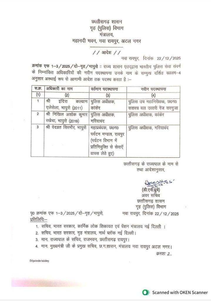 कांकेर एसपी IPS इंदिरा कल्याण एलेसेला को पुलिस उप महानिरीक्षक छग सशस्त्र बल उत्तरी रेंज सरगुजा की जिम्मेदारी दी गई है। गरियाबंद एसपी IPS निखिल अशोक कुमार रखेचा को कांकेर एसपी के पद पर पदस्थ किया गया है। वहीं आईपीएस वेदव्रत सिरमौर महाप्रबंधक छग पर्यटन मण्डल रायपुर (पर्यटन विभाग में प्रतिनियुक्ति से सेवाएं वापस लेते हुए) को गरियाबंद एसपी बनाए गए हैं।