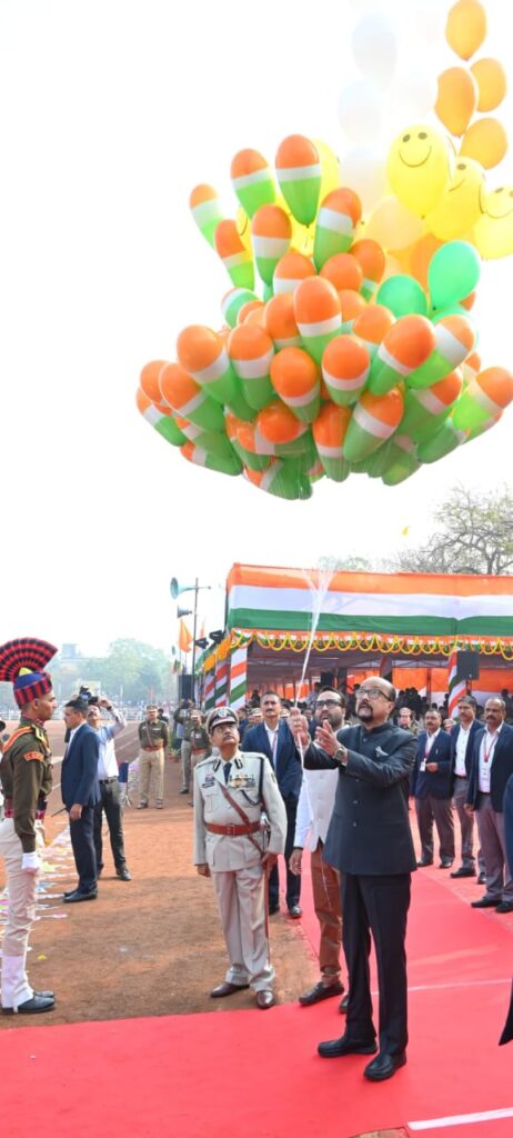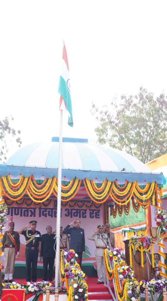 रायपुर। गणतंत्र दिवस के अवसर पर राज्यपाल रमेन डेका द्वारा आज यहां राजधानी रायपुर में पुलिस परेड ग्राउंड में राष्ट्रीय ध्वज फहराया गया और परेड की सलामी ली गई। परेड निरीक्षण के दौरान मुख्य सचिव विकास शील और पुलिस महानिदेशक अरूण देव गौतम भी उपस्थित थे।
