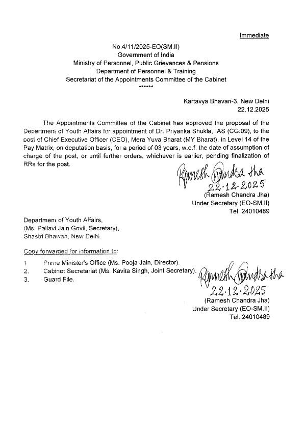कार्मिक एवं प्रशिक्षण विभाग (DoPT) की ओर से जारी आदेश के अनुसार, डॉ. प्रियंका शुक्ला को पे मैट्रिक्स लेवल-14 में यह जिम्मेदारी सौंपी गई है। उनकी नियुक्ति पदभार ग्रहण करने की तिथि से प्रभावी होगी या अगले आदेश तक, जो भी पहले हो। यह नियुक्ति तब तक प्रभावी रहेगी, जब तक MY Bharat के CEO पद के लिए भर्ती नियम (Recruitment Rules) को अंतिम रूप नहीं दे दिया जाता।