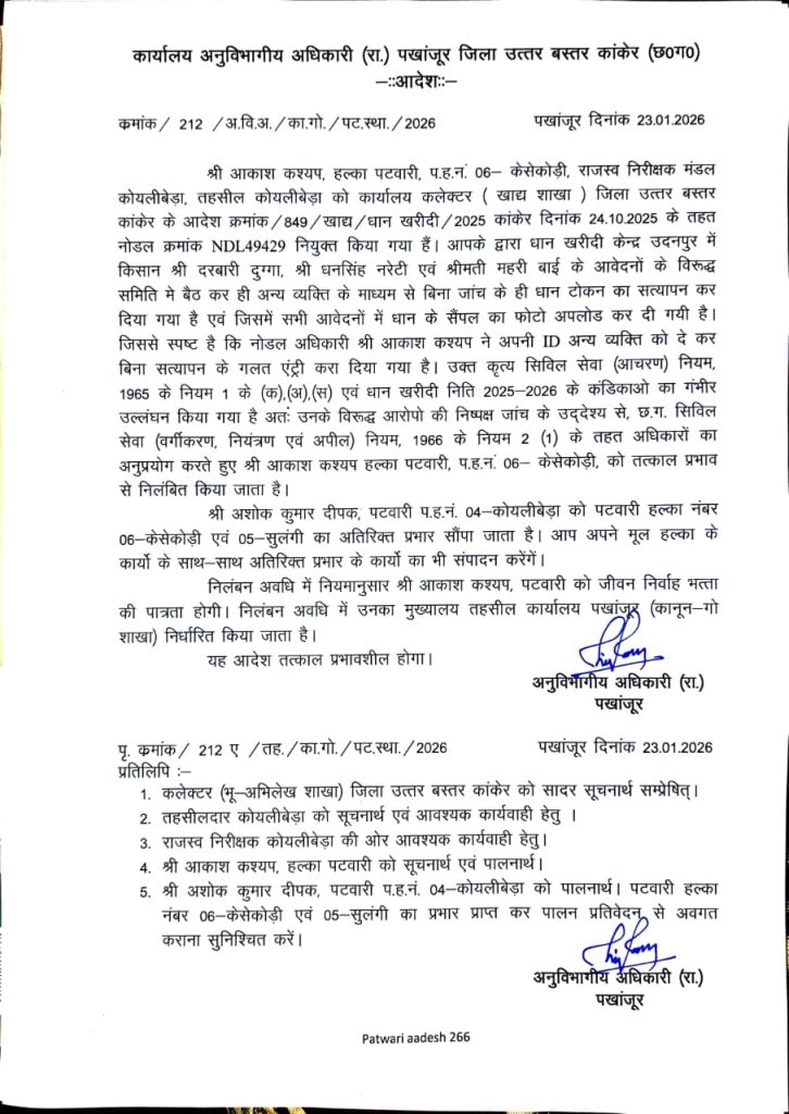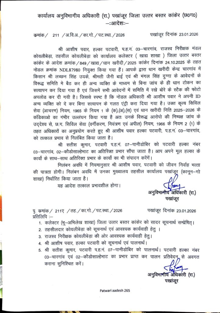 एसडीएम पखांजूर द्वारा जारी आदेश के अनुसार, दोनों अधिकारियों ने अपनी आईडी (ID) अन्य व्यक्तियों को दे दी थी और बिना जांच के ही प्रविष्टियां (Entries) कराईं. यह कृत्य सिविल सेवा (आचरण) नियम 1965 और धान खरीदी नीति 2025-26 के प्रावधानों का गंभीर उल्लंघन है.
