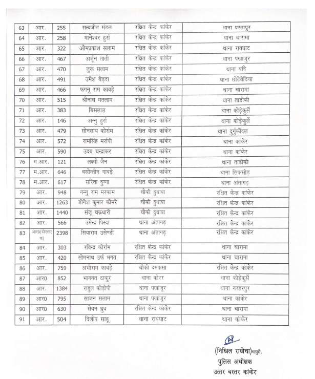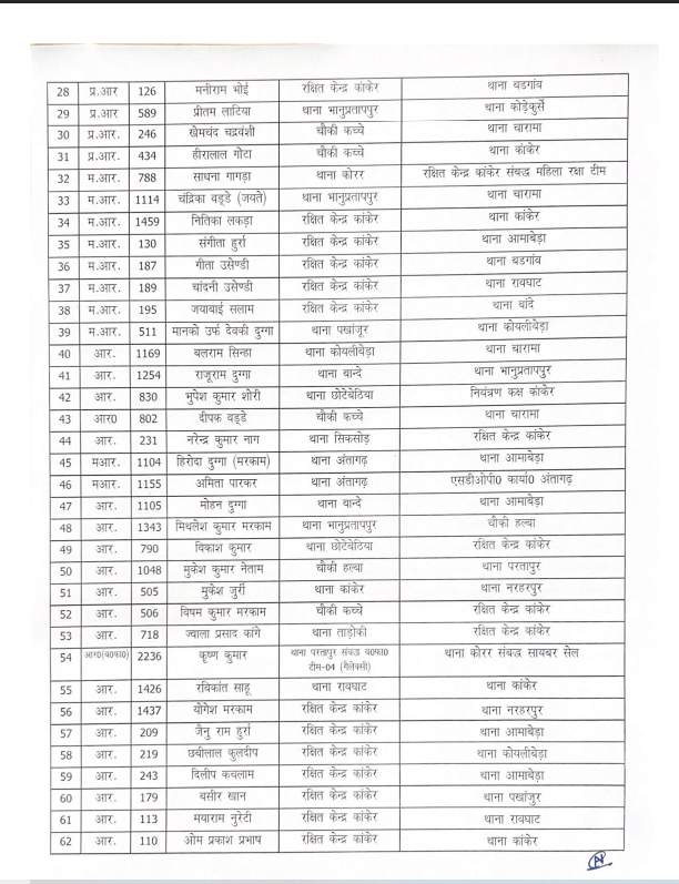 कांकेर। जिले में नए पुलिस अधीक्षक की पदस्थापना के बाद पुलिस विभाग में बड़ा फेरबदल किया गया है। एसपी ने तबादला आदेश जारी करते हुए बड़ी संख्या में पुलिसकर्मियों को इधर से उधर किया है। जारी आदेश के अनुसार तबादलों में 06 निरीक्षक, 01 उपनिरीक्षक, 04 सहायक उपनिरीक्षक शामिल हैं। इसके अलावा 28 प्रधान आरक्षक और 52 आरक्षक के भी स्थानांतरण किए गए हैं।