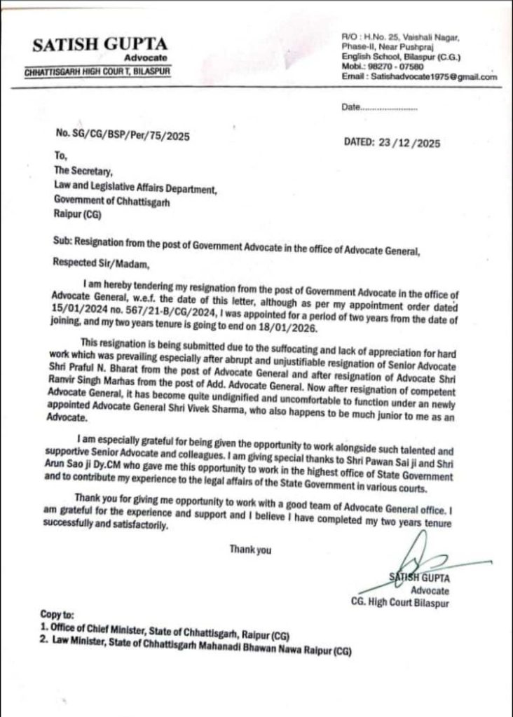 बिलासपुर। छत्तीसगढ़ के एडवोकेट जनरल कार्यालय में कार्यरत सरकारी वकील सतीश गुप्ता ने अपने पद से इस्तीफा दे दिया है। उन्होंने यह इस्तीफा कानून और विधायी मामले विभाग के सचिव को सौंपा है। अपने इस्तीफे में सतीश गुप्ता ने लिखा है कि उन्हें 15 जनवरी 2024 को दो साल की अवधि के लिए नियुक्त किया गया था, जिसका कार्यकाल जनवरी 2026 तक था, लेकिन उन्होंने समय से पहले पद छोड़ने का फैसला लिया है। उनके इस्तीफे के बाद राजनीति और कानूनी हलकों में हलचल मच गई है।