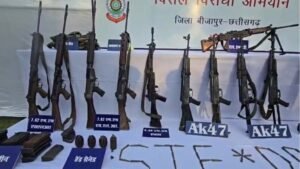 मुठभेड़ स्थल से पुलिस ने भारी मात्रा में हथियार बरामद किए हैं, जिनमें AK-47, LMG, 303 रायफल और अन्य ऑटोमैटिक हथियार शामिल हैं।