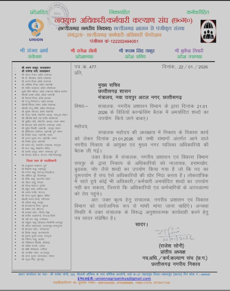 रायपुर। छत्तीसगढ़ के नगरीय प्रशासन विभाग के संचालक द्वारा वीडियो कॉन्फ्रेंसिंग में कथित तौर पर अमर्यादित और आपत्तिजनक शब्दों के इस्तेमाल का मामला सुर्खियों में आ गया है. इस संबंध में नव नियुक्त अधिकारी/कर्मचारी कल्याण संघ (छत्तीसगढ़) ने राज्य के मुख्य सचिव को पत्र लिखकर कड़ी आपत्ति दर्ज कराई है और सार्वजनिक रूप से माफी की मांग की है.